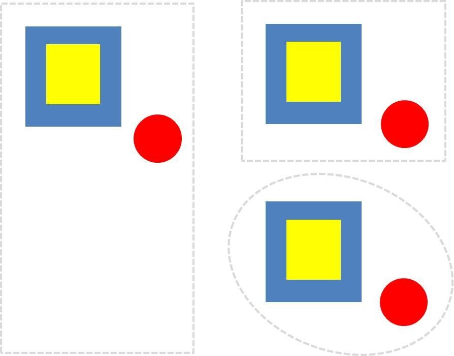 Figure: Different “matrix” things x_0 (marked by gray dashed boundaries) enclosing the same set of things (blue, yellow, red). They all have_part all other things and thus represent possible universes according to the mereology axiom.